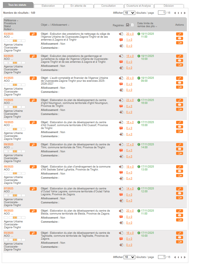 Le 17 et 19 novembre 2025 à partir de 09h00, il sera procédé dans les bureaux de l’Agence Urbaine de Ouarzazate-Zagora-Tinghir, sis au n° 237 - 238, Av Almaghrib Alarabi, Ouarzazate, à l'ouverture des plis relatif aux appels d'offres suivants: