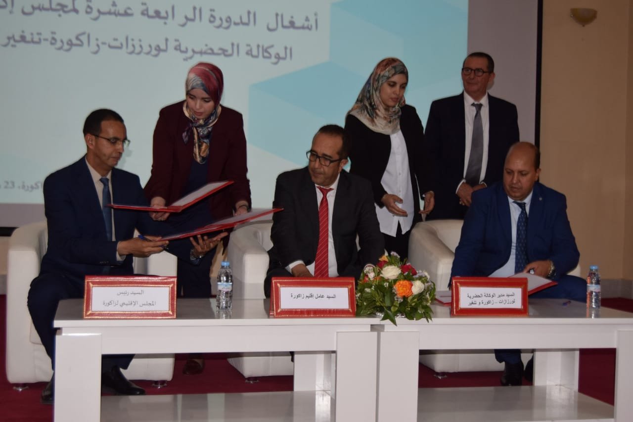 وقبل رفع أشغال هذه الدورة ،تم التوقيع على اتفاقية للشراكة والتعاون من أجل استكمال التغطية بوثائق التعمير على مستوى تراب إقليم زاكورة وقعها كل من السيد عامل إقليم زاكورة والسيد مدير الوكالة الحضرية لورزازات-زاكورة-تنغير و السيد رئيس المجلس الإقليمي لزاكورة.
