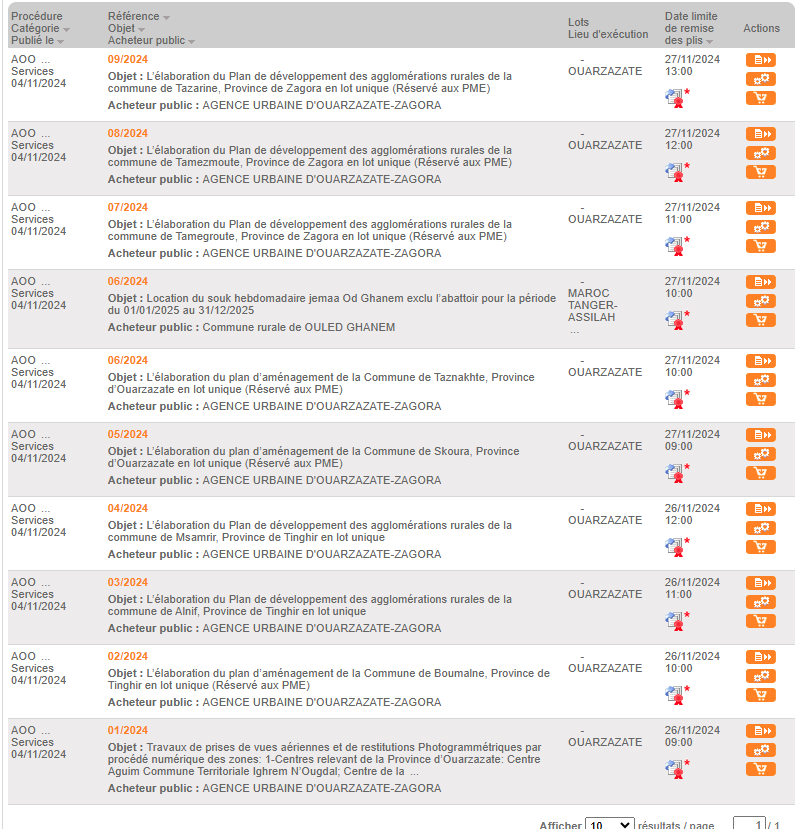 Le 26 et 27 novembre 2024 à partir de 09h00, il sera procédé dans les bureaux de l’Agence Urbaine de Ouarzazate-Zagora-Tinghir, sis au n° 237 - 238, Av Almaghrib Alarabi, Ouarzazate, à l'ouverture des plis relatif aux appels d'offres suivants:
